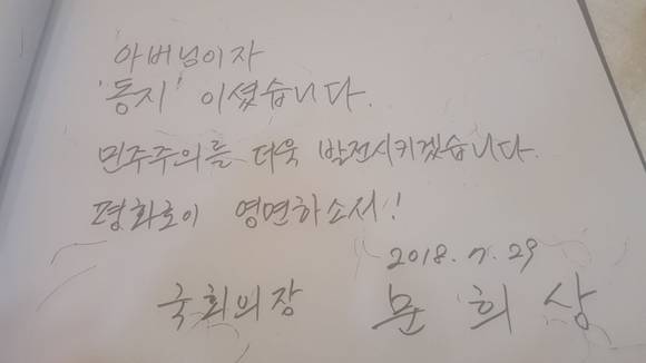 문희상 국회의장이 7월 29일(일) 오후 박종철 열사의 아버지 고 박정기씨의 별세에 조의를 표했다. 이날 문 의장을 대신해 부산시민장례식장에 마련된 빈소를 찾은 박수현 의장비서실장은 고인의 가는 길을 추모한 뒤, 방명록을 통해 “아버님이자 ‘동지’이셨습니다. 민주주의를 더욱 발전시키겠습니다. 평화로이 영면하소서!”라고 문 의장의 애도의 뜻을 전했다.