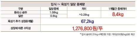 조영철 퓨리나 축우판매부장은 양평 한우는 최상의 한우 사양 관리를 하며, 부업 농가 특성상 볏집 의존도가 높은 점을 함께 집어주며, 급여 프로그램도 양평 한우에 맞게 모델링하여 좋은 결과를 거둘 수 있었다고 밝혔다. 이번 양평 농가의 육성기 일당 증체는 1.08kg로 성장에 따른 수익성을 두당 1,276,800을 추산 할 수 있다. 이를 통해 한우 사업의 근간은 역시 송아지 사양관리 그리고 육성우 성장 극대화라는 결론을 얻었다.