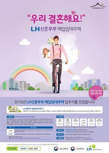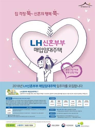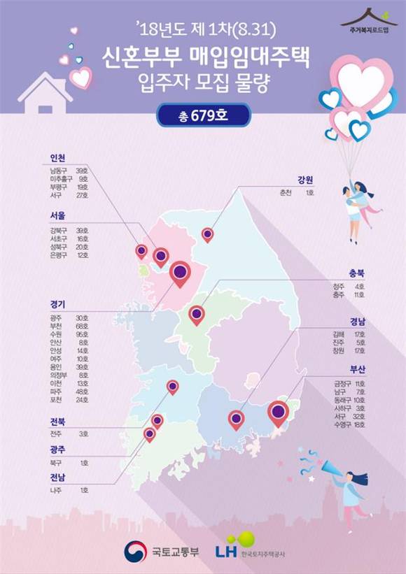 국토교통부(장관 김현미)는 8월 31일부터 신혼부부를 위한 매입임대주택의 입주자 모집을 시작한다고 밝혔다.