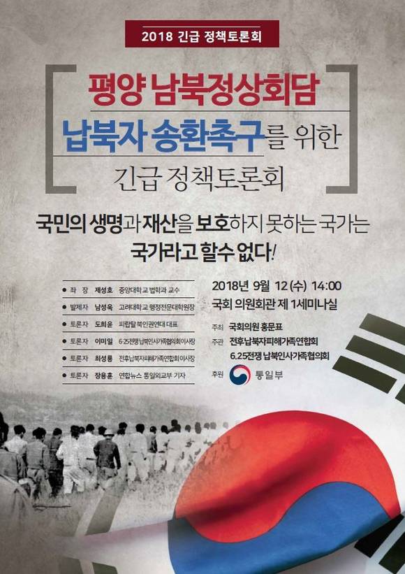 자유한국당 홍문표 국회의원(자유한국당, 충남 예산․홍성)이 주최하고 전후 납북자 피해가족 연합회와 6.25전쟁납북인사가족협의회가 주관하는 ‘평양남북정상회담, 납북자 송환 촉구를 위한 긴급 정책토론회가 9월 12일 오후 2시 국회 의원회관 제1세미나실에서 열릴 예정이다.