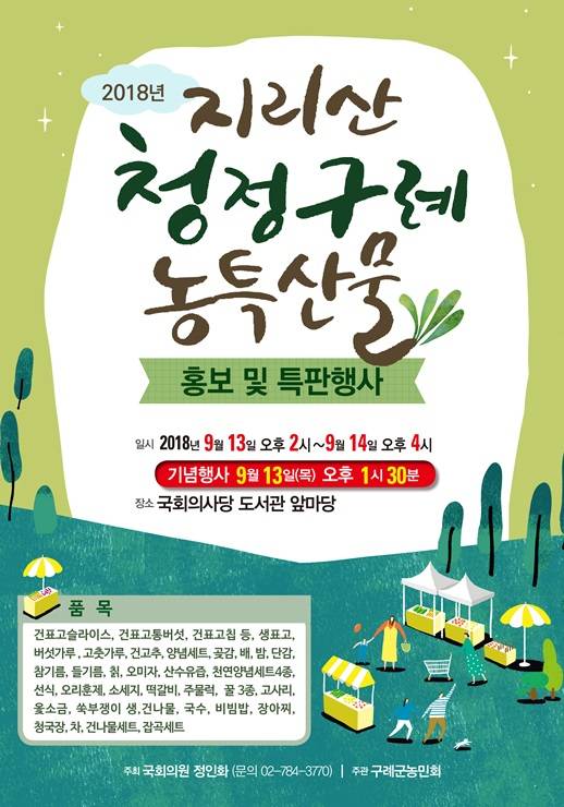 국회 행정안전위원회 정인화 의원(민주평화당, 광양·곡성·구례)은 오는 9월 13일(목)부터 14일(금)까지 이틀간 「지리산 청정구례 농·특산물 홍보 및 특판행사」 가 국회도서관 앞마당에서 열린다고 밝혔다.