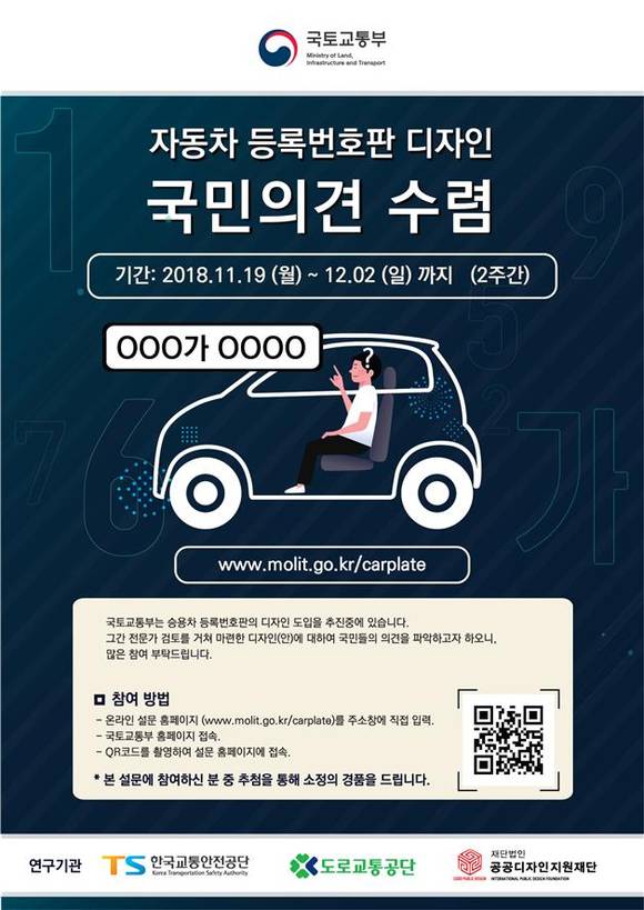 국민 선호도조사는 11월 19일부터 12월 2일까지 진행된다. 국토교통부 누리집(www.molit.go.kr/carplate)에 접속하여 참여할 수 있다.