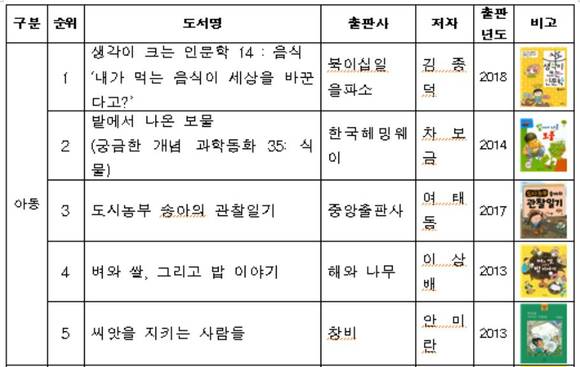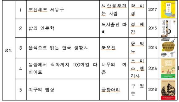 아동 부문에서「생각이 크는 인문학 14:음식(내가 먹는 음식이 세상을 바꾼다고?(을파소)」등 5종, 성인 부문에서「조선셰프 서유구(씨앗을뿌리는사람)」등 5종으로 총 10종의 도서가 선정되었다.