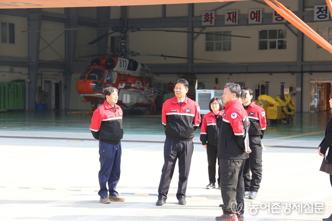 산불방지 최 일선 기관인 진천산림항공관리소를 방문한 김용관 산림항공본부장은 심태섭 소장으로부터 봄철 산불방지 총력대응 및 진화헬기 운영 현황과 초대형헬기(S-64E)와 대형헬기(KA-32T)를 현장점검하고 산불방지 비상대기중인 조종사, 정비사, 공중진화대원들을 격려했다.