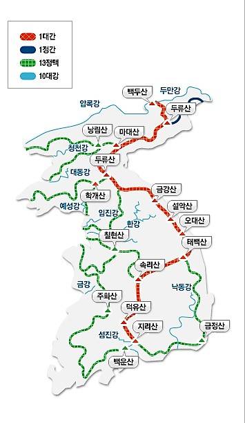 백두산 - 두류산 - 금강산 - 설악산 - 오대산 - 태백산 - 속리산 - 덕유산 - 지리산