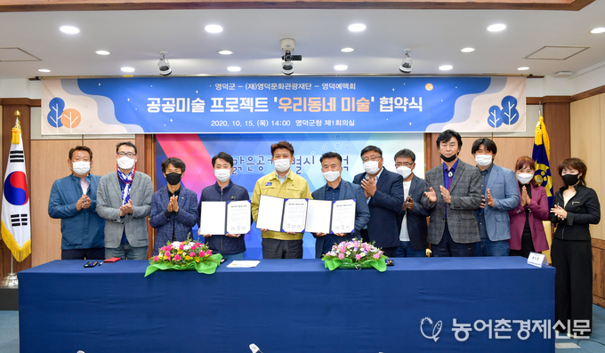영덕에서 추진 예정인 공공미술프로젝트 ‘우리동네 미술’ 사업 협약식이 2020년 10월 15일(목) 오후 2시 영덕군청 2층 회의실에서 진행되었다. 이번 협약식은 사업 주관처인 (재)영덕문화관광재단(이사장 이희진)과 영덕군, 사업 선정단체인 영덕예맥회의 3자간 협약으로 영덕군은 사업추진에 대한 행정적 지원, (재)영덕문화관광재단은 사업 운영, 영덕예맥회는 사업 실행의 역할을 맡아 2021년 2월까지 영덕군 블루로드 구간 4곳에 4개의 공공예술 조형물을 설치할 예정이다.