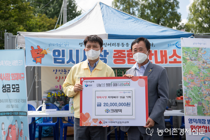 경상북도(도지사 이철우) 1억4천만원, 대구광역시(대구시장 권영진) 1억2천만원, 신협 사회공헌재단(이사장 김윤식) 5천만원, 화남건설(회장 박몽용) 3천만원, 크레텍(대표 최영수) 2천만원, 경상북도 개발공사(사장 이재혁), 한국SGI(이사장 김인수)에서 1천만원, 농어촌공사 영덕지사(지사장 채홍기), 한국전력 영덕지사(지사장 신종철), 티에스케이워터(대표 김인석)에서 500만원, 전국 시군자치구 의회의장 협의회(회장 조영훈), 경북여성단체 협의회(회장 홍순임)에서 3백만원, 예주문화예술회관 예술동호회 일동 2백2십만원, 국토정보공사 대구경북본부(본부장 박홍서), 국토정보공사 영덕지사(지사장 정준섭), 영양군의회(의장 장영호), 울진해양경찰서(서장 채수준), 영덕라이온스클럽(회장 최병일), 영덕읍체육회(회장 최병일), 보득수산(대표 최환수), 영덕군 육상연맹(회장 권오웅), 한국문화재단 및 굿보러가자 출연진 일동, 대한타일에서 1백만원을 기탁
