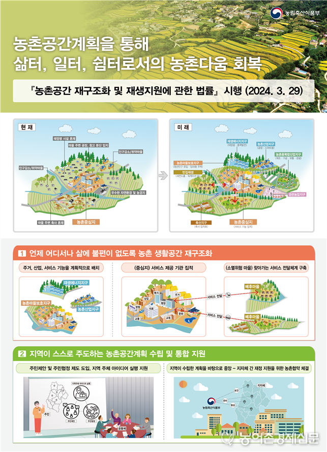 농림축산식품부(장관 송미령, 이하 농식품부)는 농촌소멸 위기와 난개발 등에 대응하고, 삶터·일터·쉼터로서의 농촌 기능 재생을 위한 ‘농촌공간 재구조화 및 재생 기본방침’(이하 농촌공간기본방침)을 발표했다.