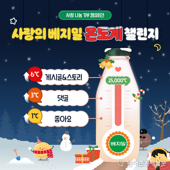 오리지널 두유 베지밀 및 건강한 식재료를 생산·판매하는 ㈜정식품(대표 정연호)이 오는 12월 7일부터 31일까지 소비자 참여형 나눔 활동 ‘사랑의 베지밀 온도계 캠페인’을 진행한다.
